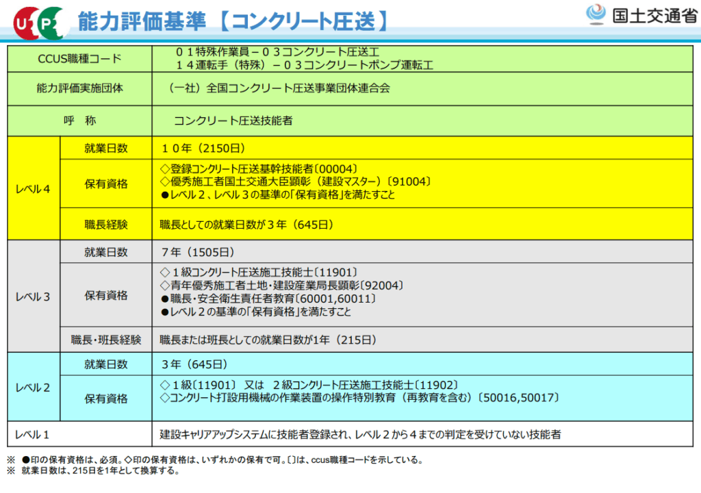 CCUSでは上記の職種が登録されており、その能力評価基準は一般社団法人全国コンクリート圧送事業団体連合会が担っています。